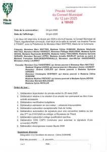 L’an deux mil vingt-quatre, le douze juin 2025 à dix-huit heures, le Conseil Municipal de Thiant, régulièrement convoqué, s’est réuni en la salle du conseil, rue Anatole France à THIANT, sous la Présidence de Monsieur Marc WATTIEZ, Maire de la Commune.